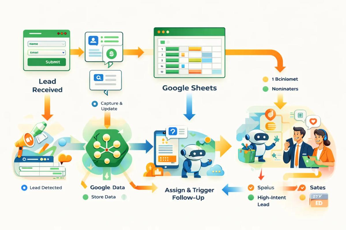 A lead fills a form, sends a message, or responds to an ad. n8n captures the data and updates a structured Google Sheet automatically. The lead source, timestamp, and status are added without human involvement.