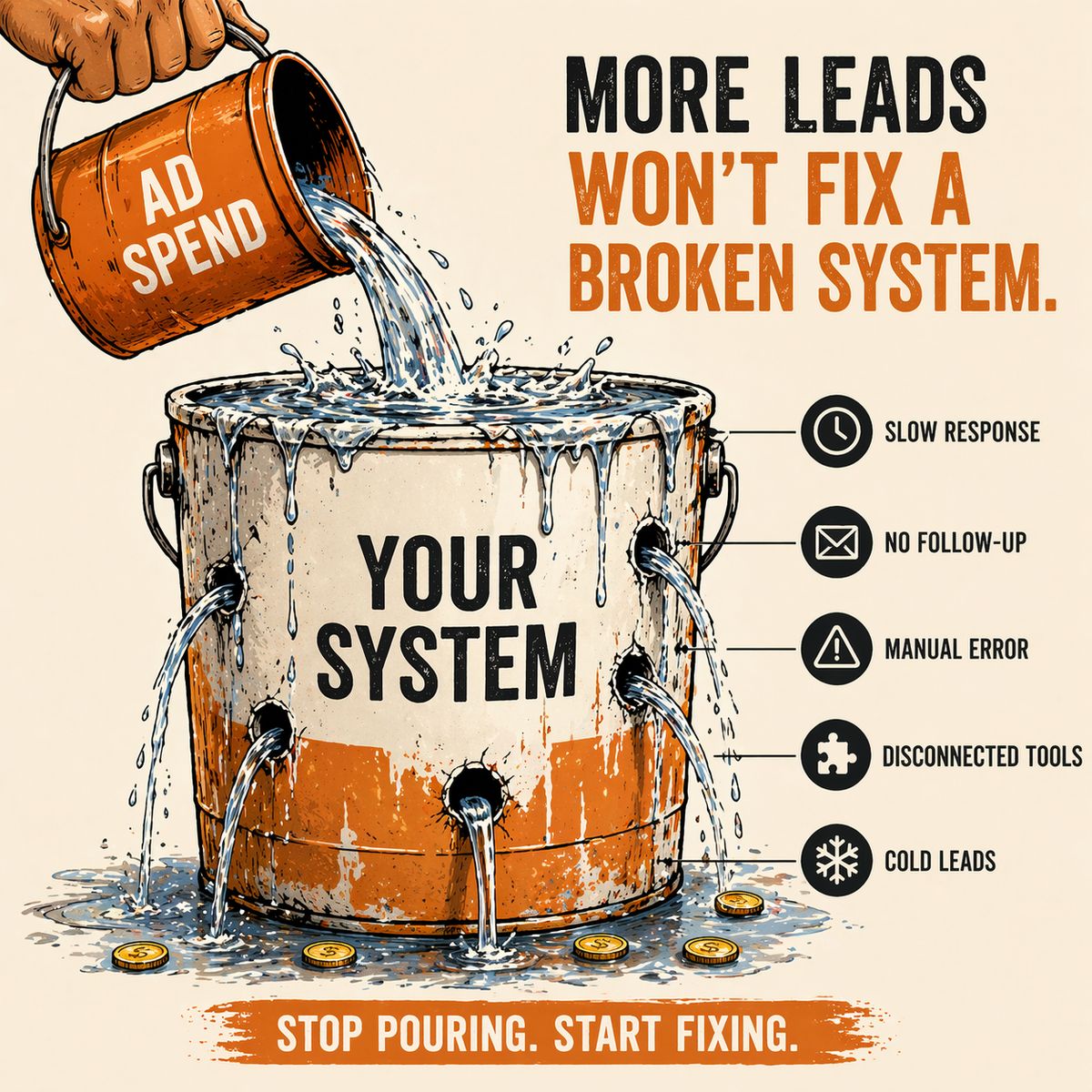 Conversion rate is low → increase ad spend → generate more leads → same system handles them → same percentage leaks out → conversion rate stays low → increase ad spend again.