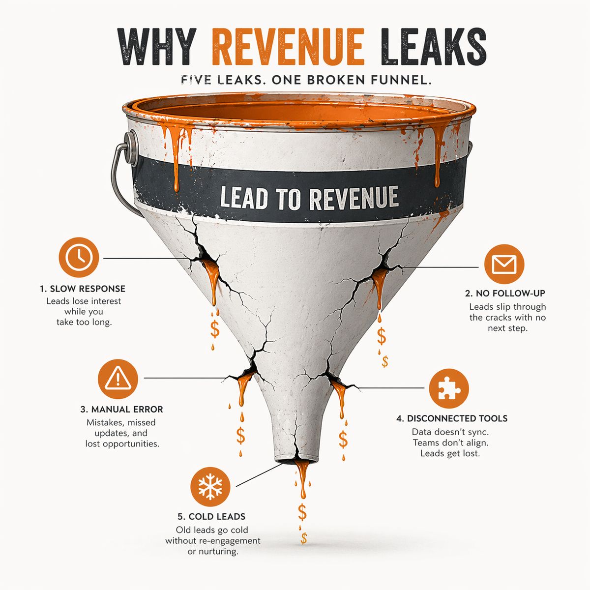 Lead leakage refers to inbound inquiries that enter your pipeline but never get properly nurtured or converted, usually because no reliable system exists to manage follow-up consistently.