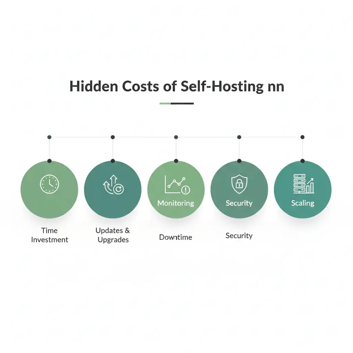 Hidden costs include time spent on updates, resolving issues, monitoring uptime, managing backups, addressing security concerns, and scaling infrastructure as usage increases.